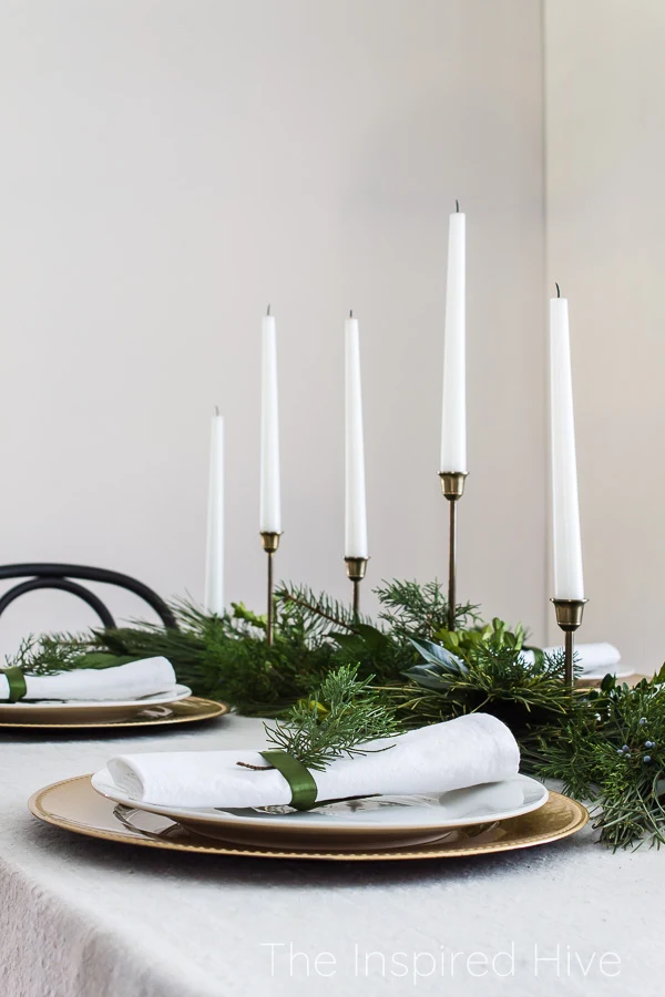 - Evergreen centerpiece runner (I used greenery from my yard, but if you don't have access to evergreens, you could order a fresh garland or centerpiece to use instead)